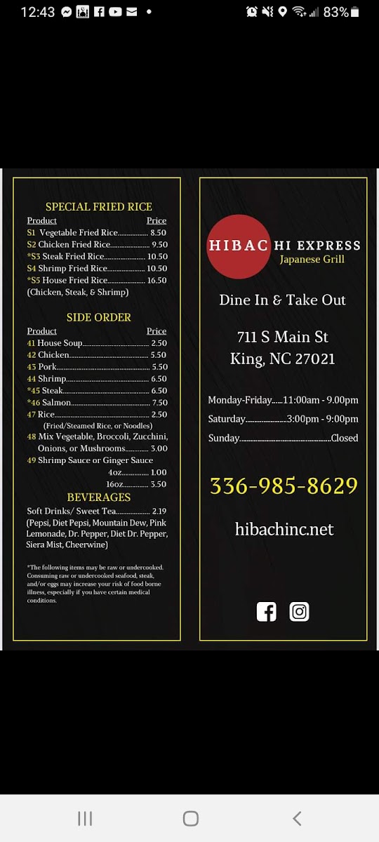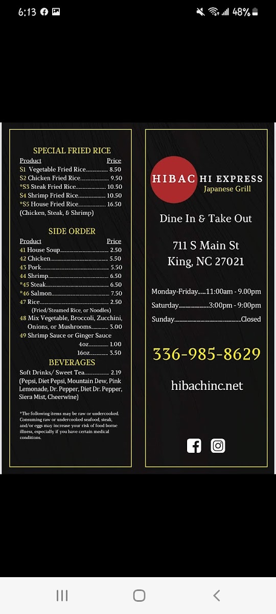 Hibachi Express - King, a charming Japanese eatery nestled at 711 S Main St, King, NC, offers a delightful culinary experience that belies its gas station location. The menu features a superb selection of hibachi favorites, with dishes expertly prepared to bring out the true essence of Japanese grilling. Diners can indulge in succulent proteins such as chicken, steak, and shrimp, paired with fresh vegetables like zucchini and mushrooms.